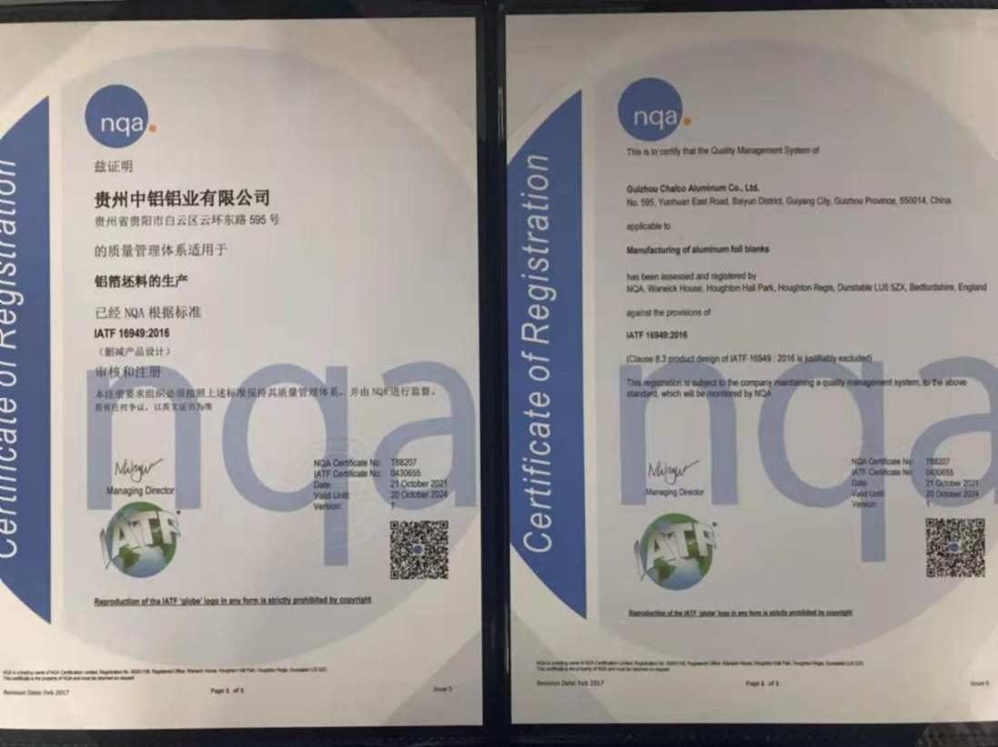 為了向高端電池箔坯料市場(chǎng)及超薄鋁箔坯料轉(zhuǎn)型,助推企業(yè)高質(zhì)量發(fā)展,2021 年以來(lái),在公司黨支部書記、董事長(zhǎng)朱玉才、總經(jīng)理蔡海濤的共同謀劃下,通過(guò)各部門協(xié)調(diào)配合,貴州中鋁于10月27日獲得IATF16949認(rèn)證證書。